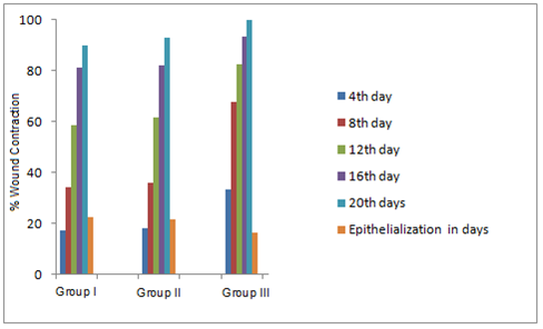 Fig. 12: Percentage wound contraction on 4th day, 8th day, 12th day, 16th day and 20th day