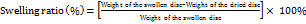 The effect of Capmul®MCM C8 concentration on the swelling ration of the produced discs was investigated in Phosphate Buffered Saline (PBS) at 37 °C. The dried polymeric were weighed and then placed in a McCartney bottle containing 5 ml PBS. The discs were removed from the swelling media at predetermined time points. The removed samples were weighed after being dried superficially using a medical tissue paper and then returned back to the swelling medium. The swelling behavior of the prepared discs was studied via calculating the swelling ratio, using Equation 1, at each time point. The obtained data were analyzed statistically (GraphPad Prism 8 software) using a two-way analysis of variance, followed by Tukey’s multiple comparisons test (n=5, p<0.05).
