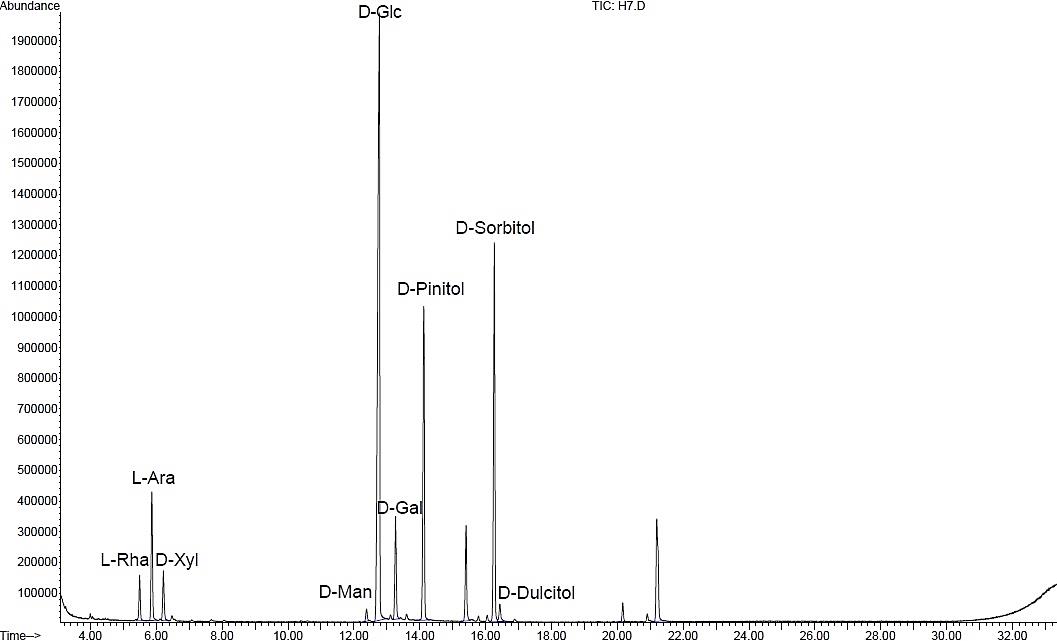 In this analyzed material, after acidic hydrolysis and derivatization with acetylated aldononitriles, L-rhamnose (L-Rha), L-arabinose (L-Ara), D-mannose (D-Man), D-glucose (D-Glc), D-galactose (D-Gal), D-xylose (D-Xyl), D-Pinitol, D-Dulcitol were identified too (fig. 2).