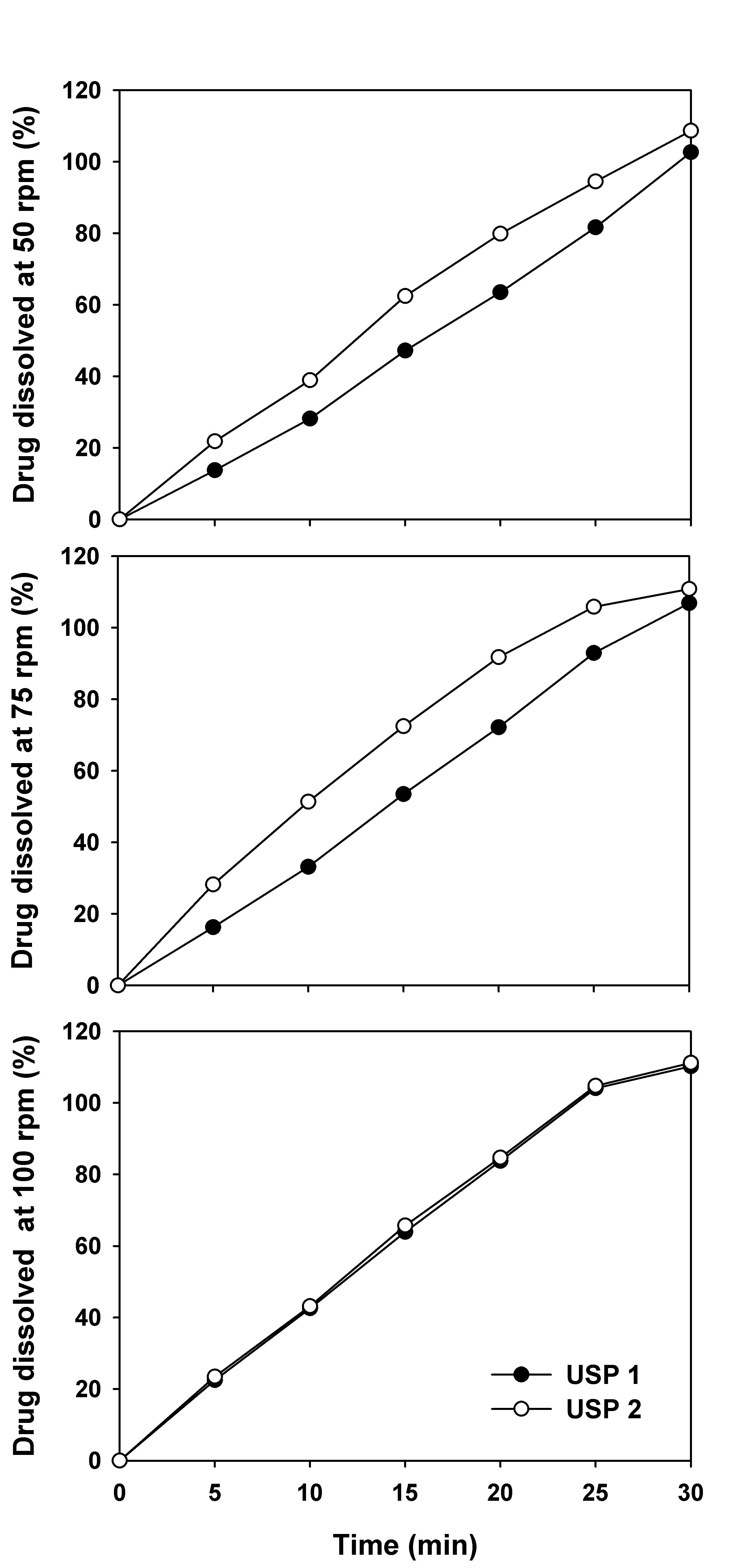 Fig. 2: Dissolution profiles of warfarin sodium using different agitation rates and USP basket (USP 1) and paddle (USP 2) apparatuses. Mean, n = 6. Error bars were omitted for clarity