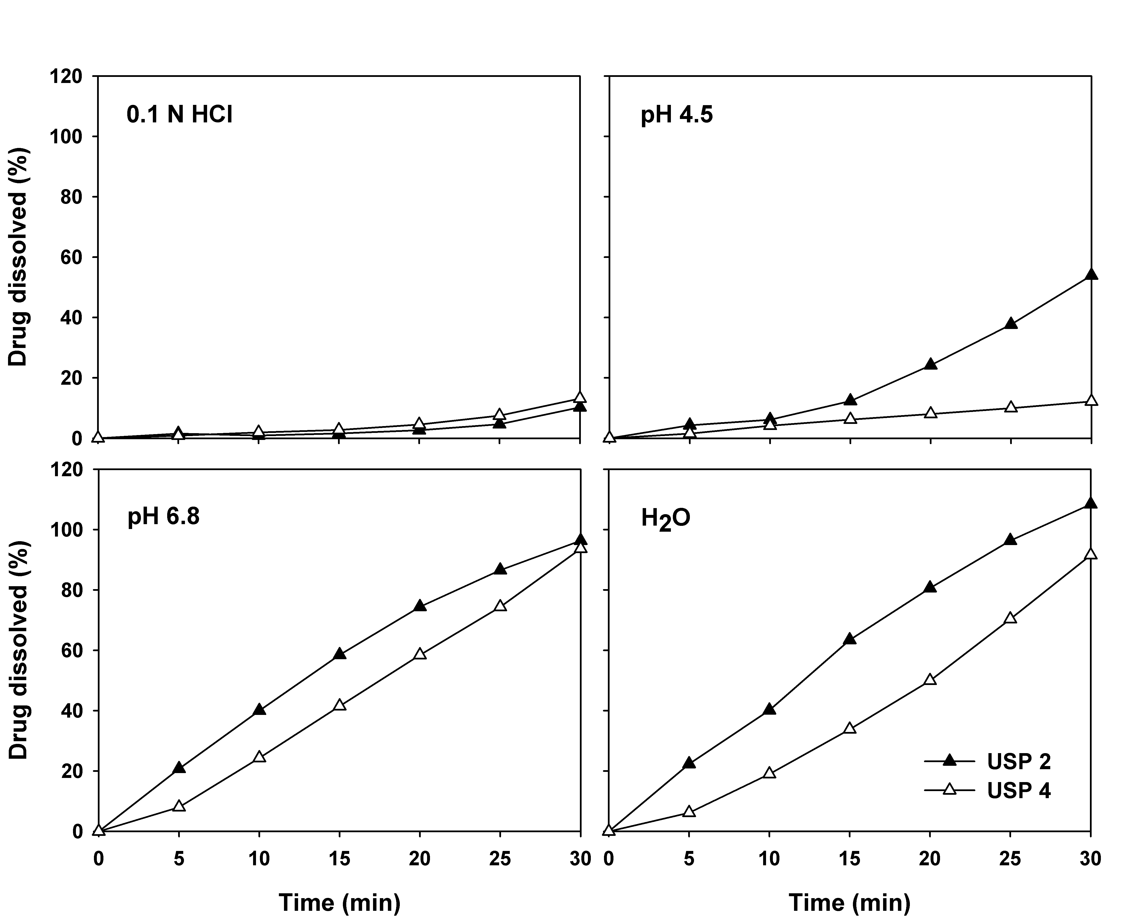 Several authors agree with the importance of this kind of studies. Wu et al. [8] indicate that more detailed studies are needed to show the effect of the hydrodynamic environment on tablet dissolution rate processes and Shabir [12], working with a class III drug, found that the in vitro release rate of a hydrosoluble drug can be accurately controlled through choice of the USP apparatus used. On the other hand, Chevalier et al. [13] shown that the dissolution test can speed up the formulation development and identify a potential problem in drug release. Due to poor solubility, class II drugs are expected to have a dissolution-limited absorption and a meaningful IVIVC should be expected. Gao [6] found that the flow-through cell method may offer advantages for establishing a meaningful IVIVC since the flow-through cell method better simulates the hydrodynamic environment of the gastrointestinal tract. Jinno et al. [14] and Jantratid et al. [15] have demonstrated that in vitro data obtained with the flow-through cell method better reflect the in vivo performance of drugs with solubility problems.