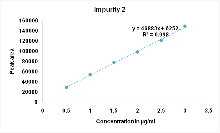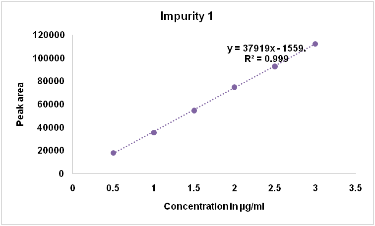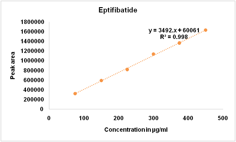 Standard solution at a concentration rage of 50–1000 µg/ml of Eptifibatide and 0.5–10µg/ml of both the impurities were prepared and analysed in the method. The calibration curve was plotted by taking concentration prepared on X-axis and peak area obtained on Y-axis.