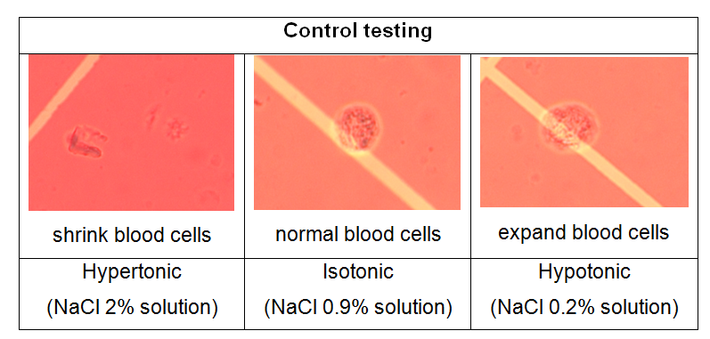 After observing using a microscope, the results showed that the four preparations have given a normal blood cell that similar results with isotonic control solution. This can be seen in fig. 1 and 2 where observations were made using a isotonic control solution in the form of NaCl 0.9%, a hypertonic control solution in the form of NaCl 2% and hypotonic control solution in the form of NaCl 0.2%. Therefore it can be said that the preparations have been made isotonic.