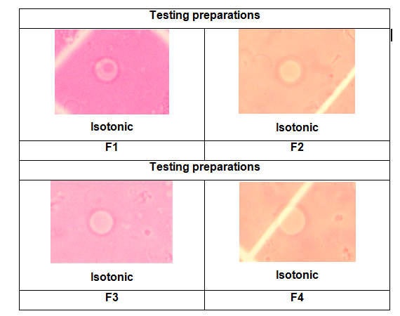 Isotonicity is an important characteristic of the ophthalmic. Isotonicity has to be maintained to prevent tissue damage or irritation of the eye. The optimized formulations were mixed with few drops of blood and then the shape of blood cells was observed in the microscope under ×45 magnifications [10-12]. The results obtained were compared with the control solution. Isotonic solutions maintain the integrity of blood cells, whereas hypertonic shows shrinkage and hypotonic shows the bulging of cells.