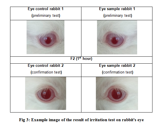 This eye irritation test aims to obtain information on the dangers that arise when the test preparation is exposed to the eyes and the mucous membranes of the eyes. In the test, a preliminary test was carried out with one rabbit first, then followed by a confirmation test with two other rabbits.