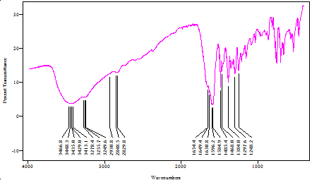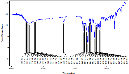 Cocrystal formation in the present study was initially confirmed by comparing the IR stretching frequencies of various functional groups present in cocrystal with pure ASA [45]. Technically no shift in the carbonyl stretching frequency was observed for ASA-valine cocrystal. This indicated the carbonyl groups in both ASA and valine remain untouched. A considerable shift in amine/hydroxyl stretching frequency was observed for ASA-valine cocrystal, which confirms the formation of a hydrogen bond between ASA and valine. The detailed stretching frequency of ASA and the prepared cocrystals are shown in table 2. The FT-IR spectra of pure ASA and ASA-valine cocrystal are shown in fig. 3, 4.