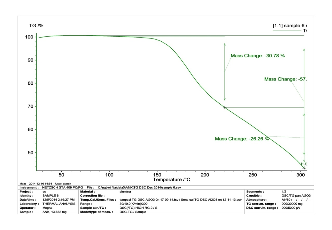 The Differential Scanning Calorimetry (DSC) analysis was conducted on a 2910 Modulated DSC V4.4E instrument (USA). The samples were weighed accurately (2 to 3 mg) and placed in hermetically sealed 40 ml aluminium crucibles, scanned from 25-300 °C at a heating rate of 10 °C/min under a dry nitrogen atmosphere [42].
