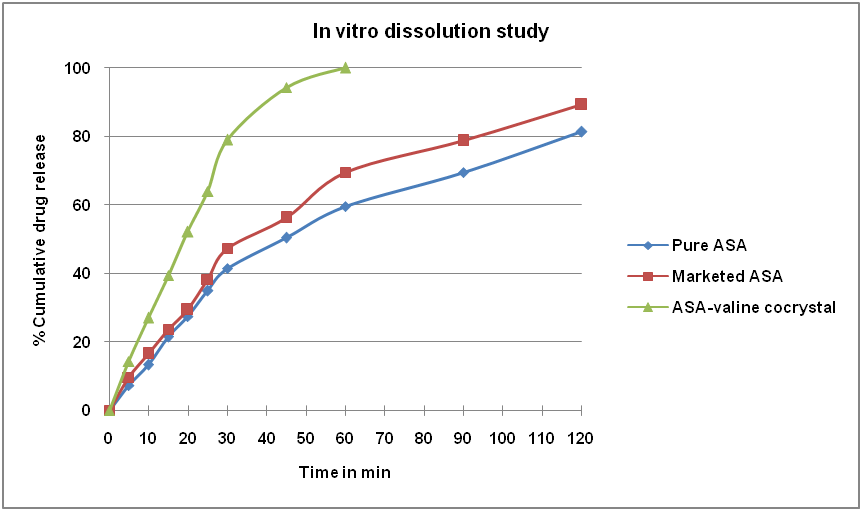 The in vitro drug release study of ASA-valine by USP type 1 apparatus (Basket method). The cocrystal was placed in a size 00 hard gelatin capsule. The dissolution media was filled with 900 ml of pH 4.5 acetate buffer solution maintained at temperature 37±0.5 °C with a stirring speed of 50 rpm. The samples were drawn at the interval of 5, 10, 15, 20, 25, 30, 45, 60, 90, and 120 min. The drug release of ASA-valine cocrystal was found to be 100% at 60th min. Where in the case of pure ASA and marketed product of ASA exhibited the dissolution rate of 59% and 69% at 60th min, respectively. The increase in dissolution rate of ASA-valine co-crystal may be due to strong intermolecular hydrogen bonding between ASA and valine. This is due to the presence of free carboxylic acid and amine functional groups in the valine. Nevertheless, the hydrophilic group present in the valine is responsible for the formation of hydrophilic ends in the ASA-valine co-crystals. Thus, the ASA-valine cocrystal showed a 1.7 and 1.44 folds increase in dissolution rate compared to pure ASA and marketed product of ASA, respectively as shown in fig. 9.