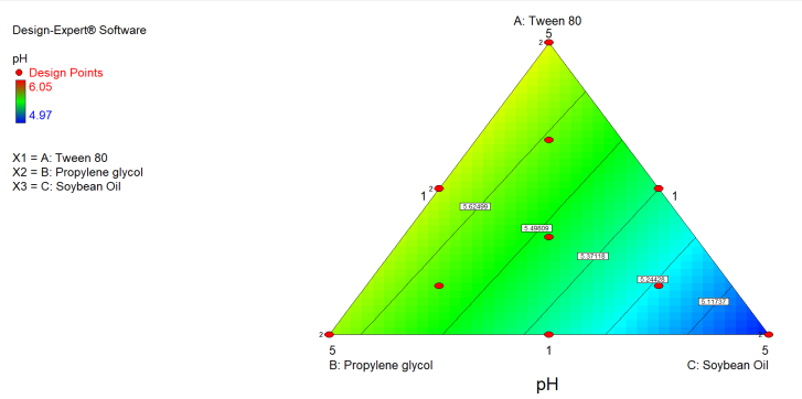 Fig. 2: Contour Plot of pH response: X1 = A: Tween 80, X2 = B: propylene glycol, X3 = C: Soybean Oil (Design expert® Ver. 7.0.0.)