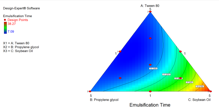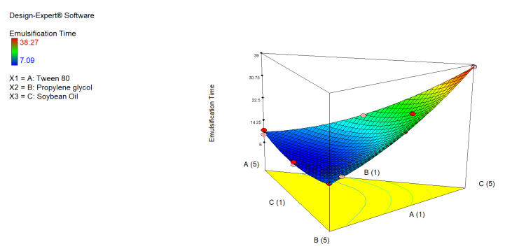 Y = emulsification time, A: Tween 80, B: Propylene glycol, C: Soybean Oil.