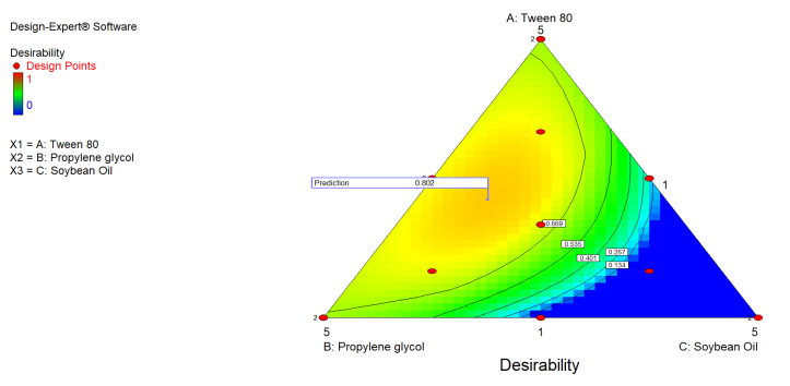 The pH was in the range 4.5-6.5 [17]. The minimum emulsification time was 2-20 seconds because the emulsification time was less than 60 seconds fulfilling the grade a requirements [24]. The optimal formula result obtained from the simplex lattice design was a formula with a ratio of Tween 80: propylene glycol: soybean oil (4.98: 1.02: 1) with a desirability value of 0.80. The desirability value indicated that the response variable chosen for formula optimization could reach the optimal point according to the desired target. Fig. 4 shows the relationship between the components (Tween 80, propylene glycol, and soybean oil) and the active substances of the MFG on the desirability value.