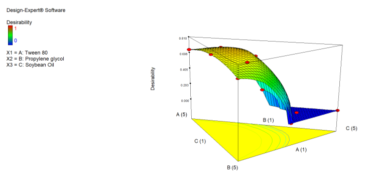The oil component could increase the emulsification time of nanoemulsion. Zhao et al. (2010) stated that the addition of ethyl oleate to SNEDDS could increase the emulsification time even though the particle size became smaller with increasing surfactant concentration [9]. Increasing the concentration of oil could slow down the emulsification time because of smaller concentrations of surfactants and cosurfactants, so they could not form emulsions in a short time [21, 22]. Short emulsification time was influenced by small oil concentrations and high cosurfactant concentrations, so that the viscosity was smaller [23]. Based on fig. 4 on the contour plot, the blue color shows the smallest emulsification time value followed by green, yellow, and red. The red color shows the greatest emulsification time. This red area is affected by an increase in soybean oil. The blue areas are affected by Tween 80 and Propylene glycol. The lower the emulsification time was, the better and faster nanoemulsions in distilled water media were formed.