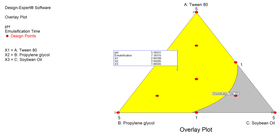 Based on fig. 5, superimposed contour plot of pH response and emulsification time is generated. The resulting superimposed resulted in a yellow area giving optimal response. This area provides a prediction of the optimal formula with a desirability of 0.802. The optimal formula composition based on the analysis obtained, a comparison of Tween 80: propylene glycol: soybean oil was with a composition of 2.69: 2.64: 1.67 parts.