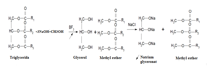 The extracted oil or fat cannot evaporate; therefore, the derivatization into the form of methyl ester should be done in order to become a volatile compound [23]. A volatile compound is a requirement of separating the mixture by gas chromatography. Derivatization of fatty acid can be done both through acid and base [24].