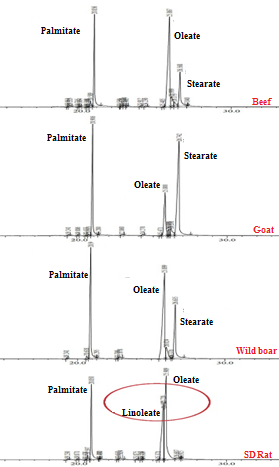 In table III, it can be seen that one of the characteristics of SD rats' fatty acid is that; they have Linoleate fatty acid (18: 2), which other animals do not have. The result of the analysis of fat profiles in boars, goats, and cows is a shift in the fatty acid content compared to previous research [26]. Guntarti's research [20] shows that boars' fatty acid has higher unsaturated fatty acids, while cows' fatty acid has higher saturated fatty acids. The differences in fatty acid constituents can be caused by the differences in animals' origin, food, or species (fig. 3).