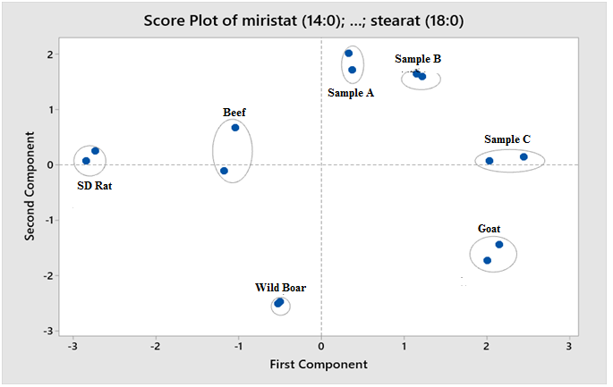 The chromatogram data of fatty acid methyl ester content from each Sprague Dawley rats, boars, goats, and cows were grouped using chemometrics PCA with Minitab 19 [25].