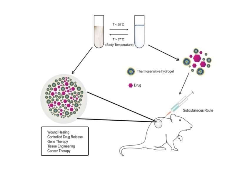 Fig. 1: This schematic diagram represents the sol-gel transition of thermo-sensitive hydrogel given through the subcutaneous route and its various applications
