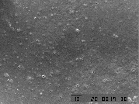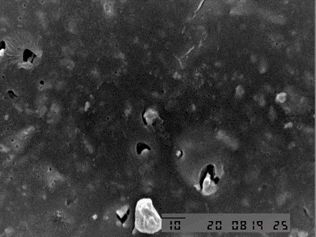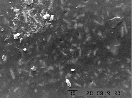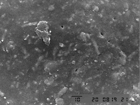 Representative SEM micrograph of samples before and after water storage for 7 d is presented in fig. 1 and 2. It was noted that all surfaces of the sealers had micromorphological changes after the solubility test. The epoxy resin-based sealer had an external surface that appeared to be mostly homogenous rough surface and uniformly scattered globular-like particles (fig. 1 A). The loss of matrix was apparent, and the filler particles were more noticeable (fig. 1 B). The chitosan nanoparticles were distinguishable on the surface of the epoxy resin-based sealer mixed with chitosan nanoparticles before the solubility test (fig. 2 A). After the solubility test, the surface appeared to be similar to before; although some matrix dissolved, chitosan nanoparticles remained obvious embedded in the sealer (fig. 2 B).