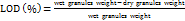 LOD was used to determine the percentage of water contained in the granules by weighing the granules before and after the drying process. LOD was calculated using Equation (3):
