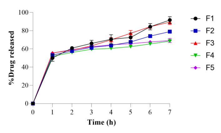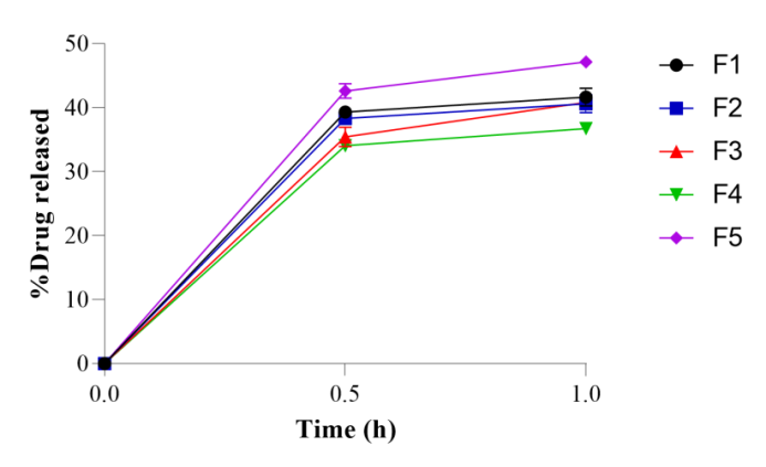 Overall, the results show that all formulations were able to sustain until a total of 8 h. This indicated that the presence of Eudragit® RL as a hydrophobic polymer was able to completely to coat the drug molecule resulting in prolonged drug release [8]. Moreover, the swelling properties of HPMC was able to form a gel barrier that controlled the release of PPH [27,28]. Specifically, all the liquisolid formulations released less than 50% after 1hour in the simulated gastric fluid, with the lowest released percentage was given by F4. In contrast, F5 provided the highest amount of PPH released, 47.13±0.35% after 60 min in the first media. Furthermore, the trend of results obtained in the simulated intestinal fluid was slightly similar to those in the simulated gastric fluid.