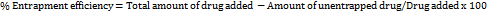 For estimation of the entrapped drug in the prepared vesicle formulation, the unentrapped drug is separated by cooling centrifugation (7000×gm) at 4 °C using a cooling centrifuge for 60 min. Then washing through 40 ml PBS (pH 7.4). The supernatant is collected and the quantity of the unentrapped drug was estimated by UV spectrophotometer at 271 nm, formula for calculating % entrapment efficiency is as follows [19].