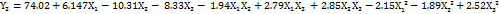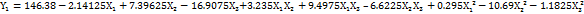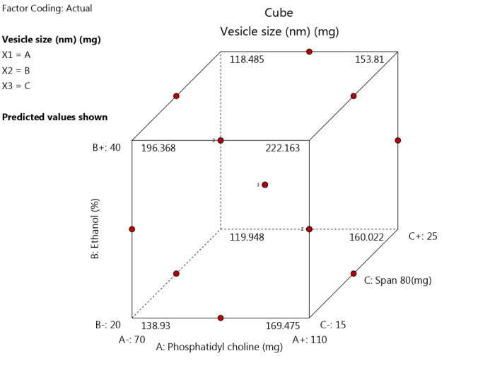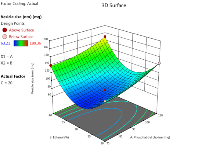 Where Y1 is Response 1: Vesicle size (nm), X1 is Phosphatidylcholine (mg), X2 is Ethanol (%), X3 is Span 80 (mg)