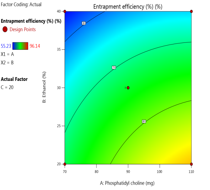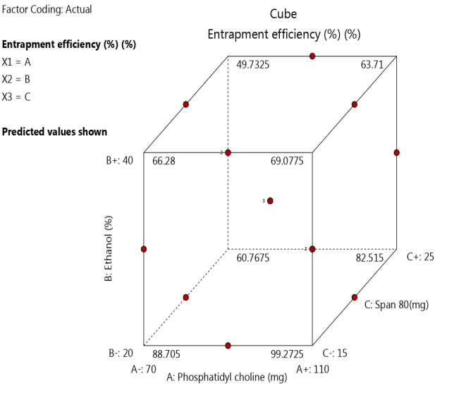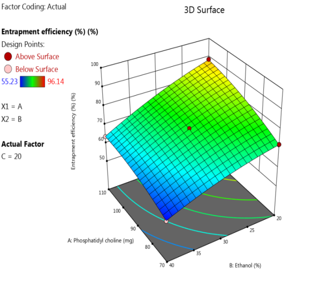 Where Y2 is Response 2: Entrapment efficiency (%), X1 is Phosphatidylcholine (mg), X2 is Ethanol (%) and X3 is Span 80 (mg)