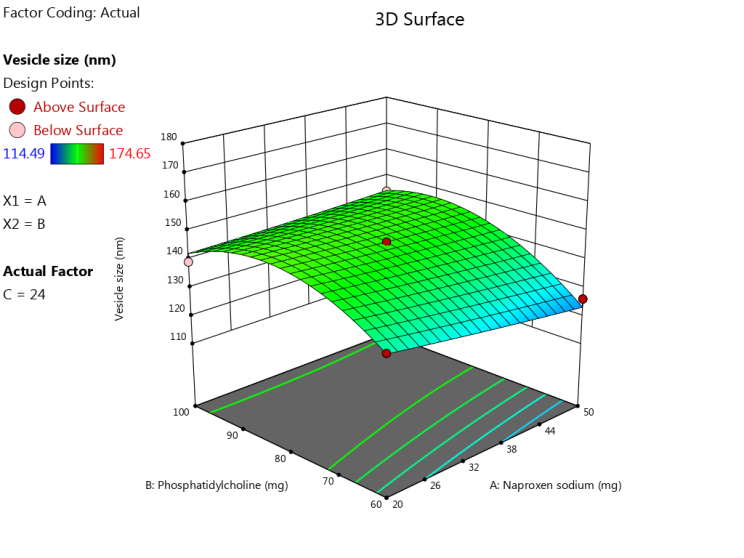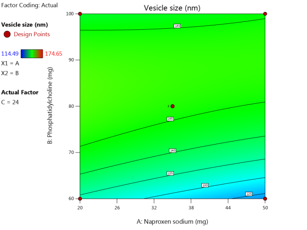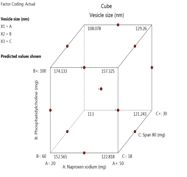 Where Y1 is Response 1: Vesicle size (nm), X1 is Naproxen sodium (mg), X2 is Phosphatidylcholine mg), X3 is Span 80(mg)