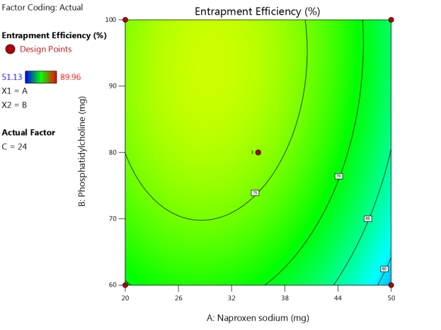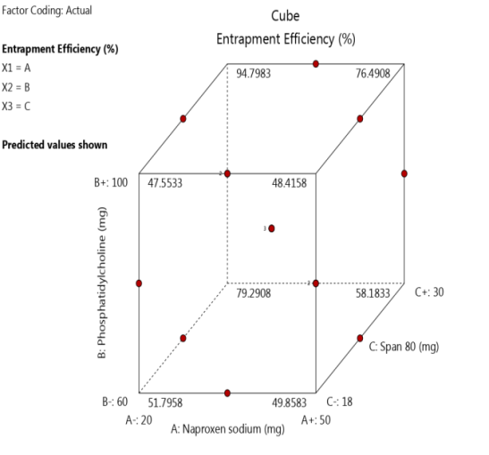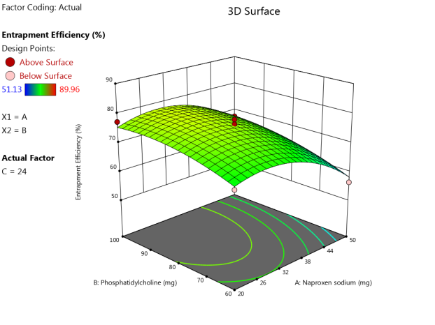 Where Y2 is Response 2: Entrapment efficiency (%), X1 is Naproxen sodium (mg), X2 is Phosphatidylcholine (mg), X3 is Span 80(mg).