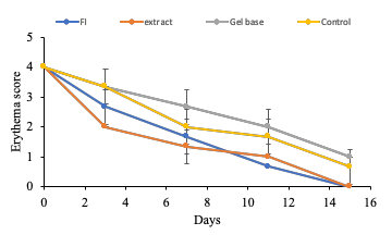 The results of wound contraction and erythema score of GS extract gel are shown in the fig. 3 and fig. 4.