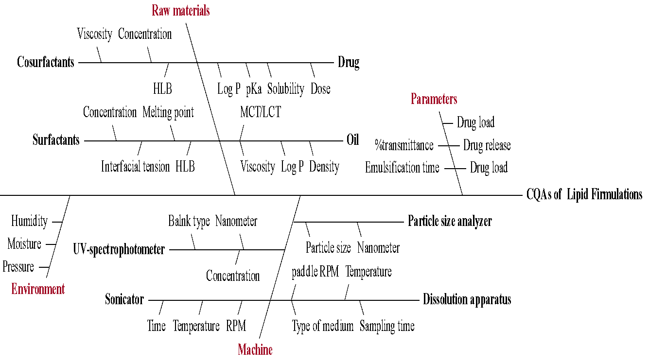 Risk assessment is a combined effort of identifying and evaluating the factors that may have an impact on the product’s CQAs. The risk assessment tools help in identifying and mitigating the risks and prioritize the risk as high, medium or low based on the impact level. The two qualitative tools used in the present study were Fishbone diagram and Risk Estimation Matrix table. Fishbone diagram (fig. 1) was constructed by using JMP Ver 13.2 software. Fishbone diagram depicts the cause and sub causes affecting the CQAs and risk assessment matrix helps in categorizing the risk. The table 3 represents the risk estimation matrix for ETV-SMEDDS.