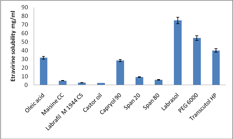 The solubility of Etravirine in various oils, surfactants and cosurfactants was checked. To perform the solubility study, the excess amount of drug was added to each excipient (2 ml) and vortexed for 48 h to maintain the equilibrium. The samples were centrifuged at 3000 rpm for 15 min. The supernatant liquid was filtered through a 0.45 µm Millipore® filter and suitably diluted with a solvent mixture of Methanol and Water (1:9) and analyzed at 310 nm using UV Spectrophotometer (UV 1800 Shimadzu). Studies were carried out in triplicates to assure accuracy [11].