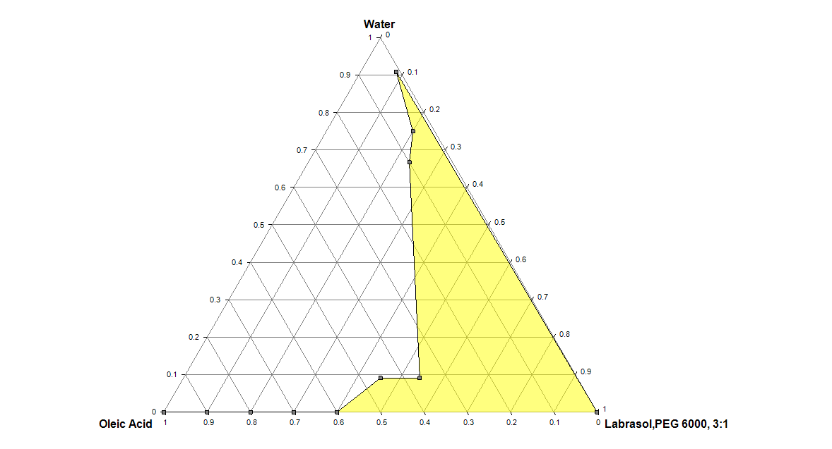 The main objective is to study the relationship between the phase behavior relative to the composition, which helps in determining the concentration range of components for the formation of an emulsion. In order to apply DOE for the formulation, it was necessary to identify the highest self-emulsifying region from ternary phase diagrams. Amongst the different combinations, Oleic acid with Labrasol and PEG 6000 at the Smix ratio of 3:1 was able to give a maximal region for stable nano/microemulsion.