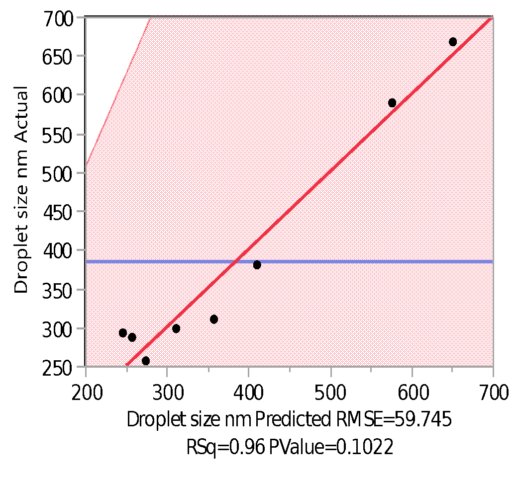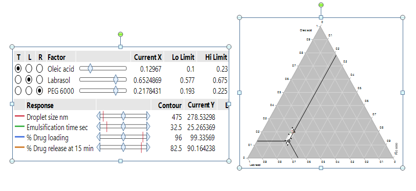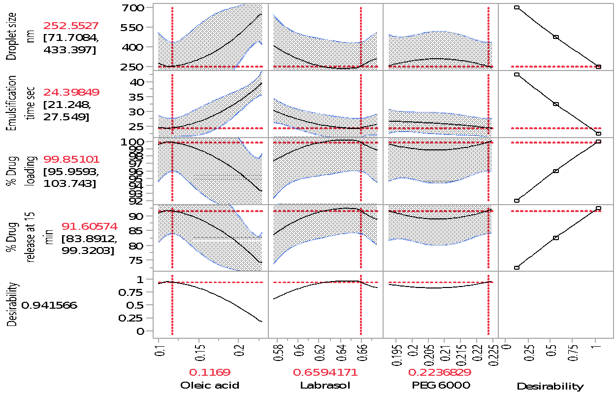 Model evaluation was carried out by incorporating the various responses obtained for all the eighth formulations into the design. The data of Droplet size (nm), Emulsification time (sec) % Drug loading and % Drug release at 15 min were statistically analyzed by various multiple regression models. The validation of the design was carried out with the help of Ternary Mixture Profiler. The profilers consist of ternary plot, factor settings with the controls and response settings and its controls. The verification batch was prepared as per the Ternary Mixture Profiler and checked for the predicted CQAs. The lack of differences in the variance between observed and predicted responses indicates the goodness of fit.
