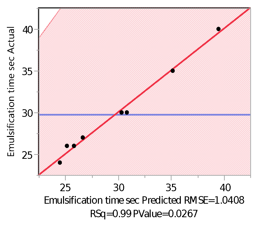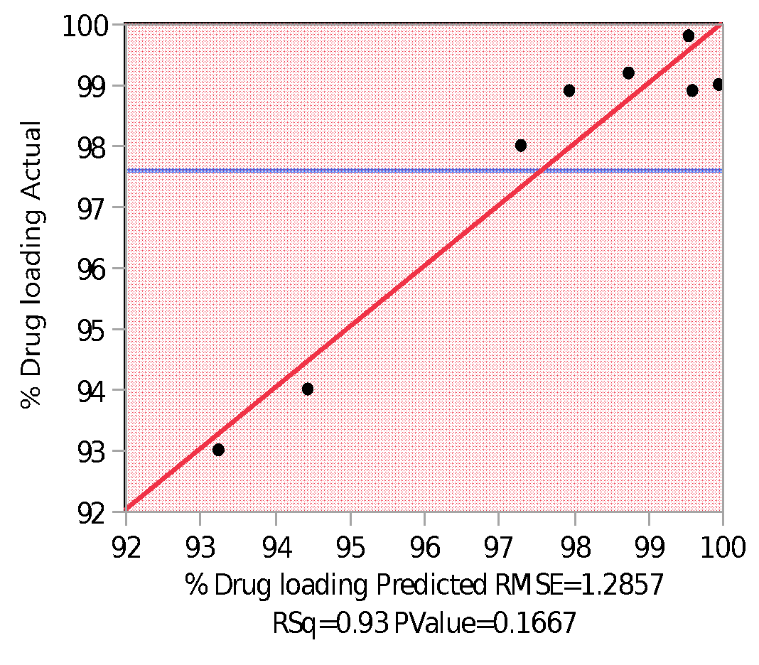 The application of DOE tools is important in achieving quality within the product with minimal experimentation. Hence, Mixture design was employed for 3 factors (oil, surfactant and cosurfactant) and 4 responses (particle size, emulsification time, drug loading and % drug release) and the extreme values drawn from the phase diagram was specified in the design along with the required target values for the responses. Within a few steps of computing the formulation trials initially, an optimal design was selected under mixture design for which randomized run order of 8 default runs was generated by the software. The characterization report obtained for the prepared formulations was integrated to the design matrix in order to plot the known responses and also mainly to predict the not formulated and non-evaluated intermediate combinations of the excipients and to predict a continuous response curve which was later used in optimizing and validating the best formulations with best outcomes.