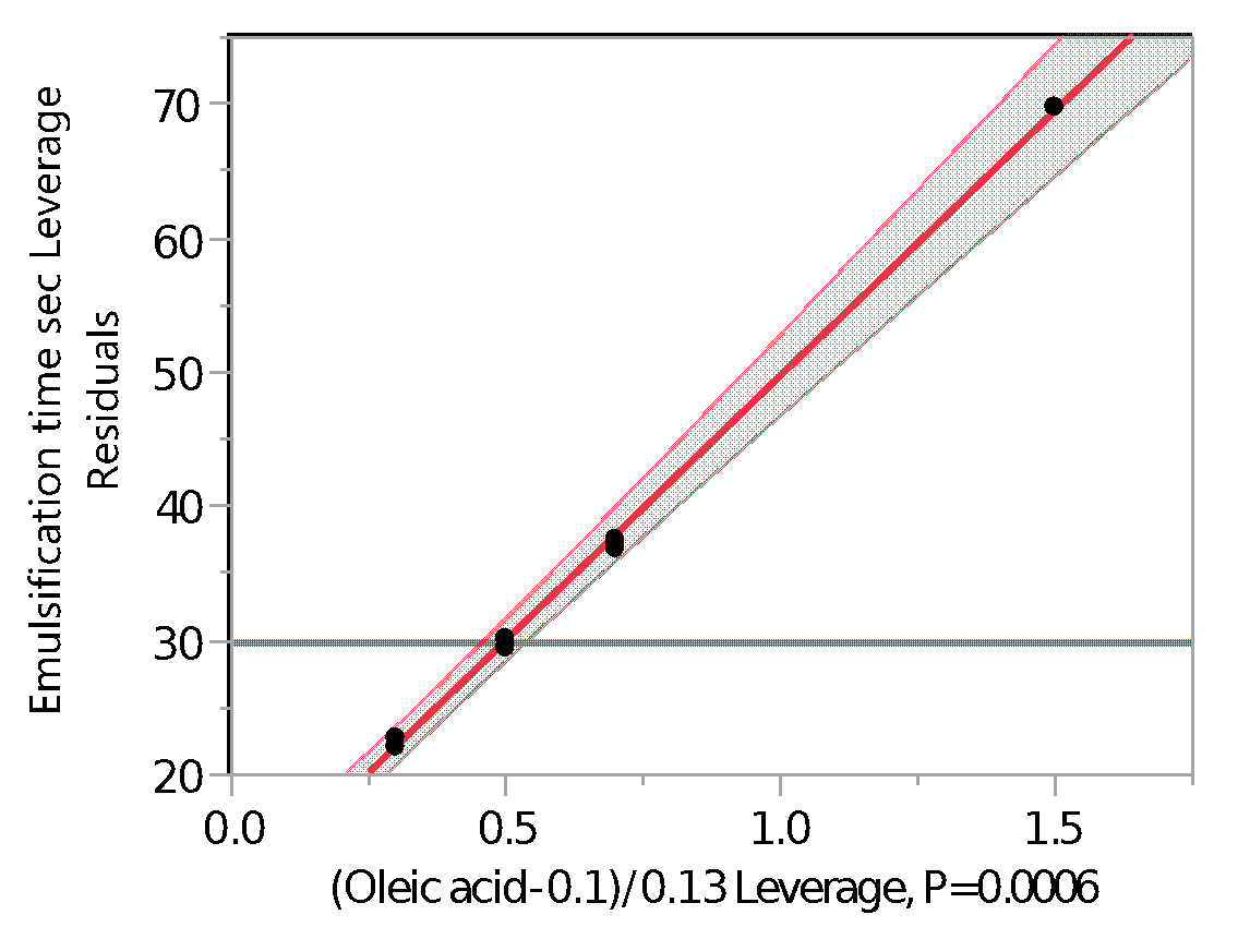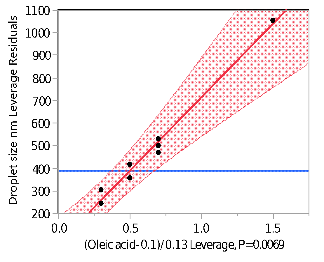 The effects summary of the whole model was used to investigate the effect of independent variables on dependent variables. In the graph, the length of each bar shows the effect of variables and the magnitude of the effect on the quality attributes. In the effects summary table the bar presenting Oleic acid and Labrasol crosses the blue vertical line indicating the significance. Hence, the material attributes like Oleic acid and Labrasol considered in the design were having a significant influence on the responses.