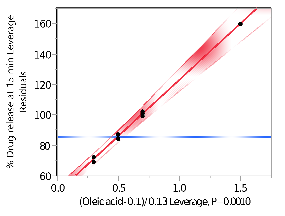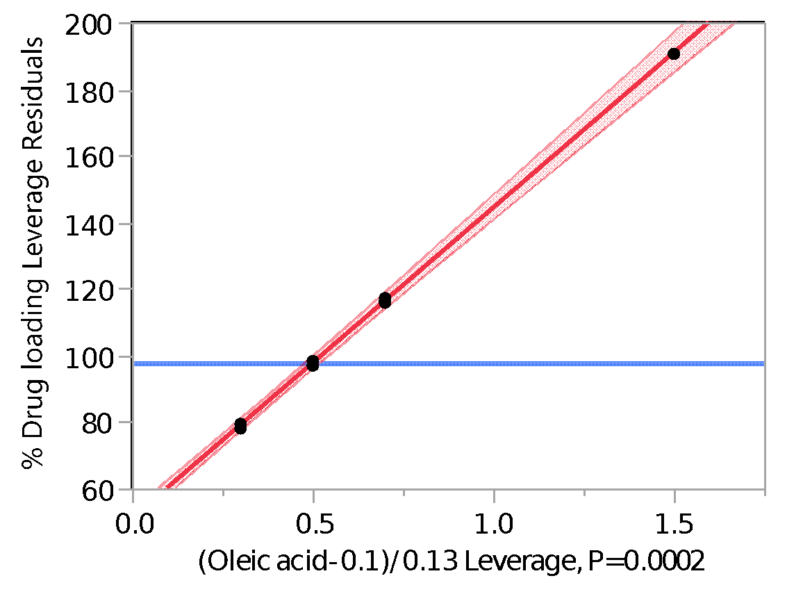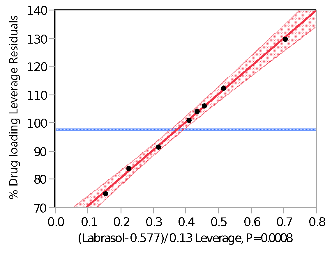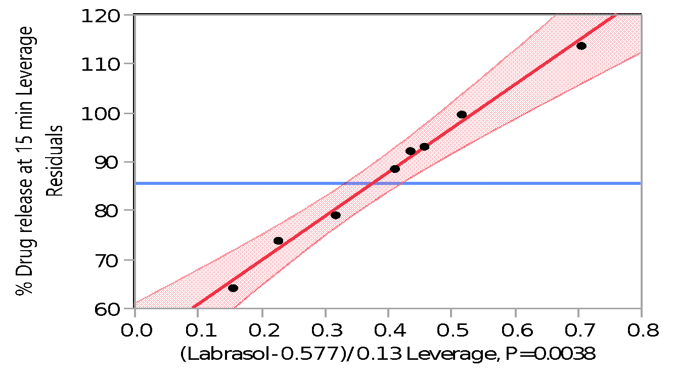 The data obtained for all eight formulation batches were integrated in the design to check the model fit. The data obtained was analyzed statistically by fitting multiple regression models with the intercept set to zero. The statistically significant models determined for droplet size (nm) (R2= 0.96 and p-0.1022), emulsification time (sec) (R2= 0.99 and p-0.0267), % drug loading (R2= 0.93 and p-0.1667) and % drug release at 15 min (R2= 0.96 and p-0.0911) were statistically significant. The effects test report and leverage plots obtained for all the individual responses considered in the design are presented in table 6 and fig. 4, respectively. The effects test report obtained for the droplet size indicates Oleic acid (p-0.0069) has a significant effect on the model. The emulsification time depends on both Oleic acid (p-0.0006) and Labrasol (p-0.0072). The % drug loading is influenced by Oleic acid (p-0.0002)and Labrasol (p-0.0008), and similarly, the % drug release also depends on Oleic acid (p-0.0010)and Labrasol (p-0.0038).
