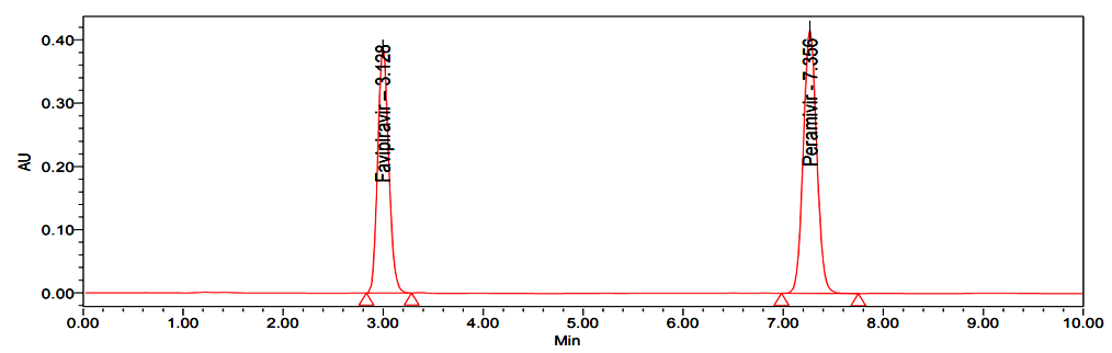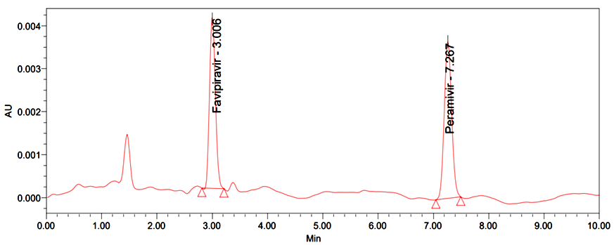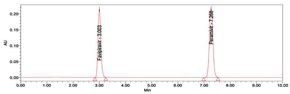 Six replicates of a sample solution containing Favipiravir (100μg/ml) and Peramivir (100μg/ml) were analysed on the same day. Peak areas were calculated, which were used to calculate mean, SD and %RSD values.