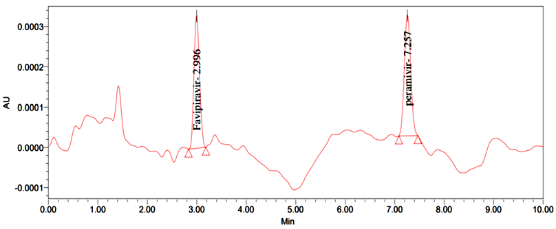 To optimize the chromatographic conditions, different ratios of phosphate buffer and the acetonitrile in the mobile phase with isocratic and gradient mode were tested. However, the mobile phase composition was modified at each trial to enhance the resolution and also to achieve acceptable retention times. Finally, 0.1% OPA buffer and acetonitrile with isocractic elution was selected because it results in a greater response of active pharmacy ingredient and their impurities. During the optimization of the method various stationary phases such as C8, C18 phenyl and amino, inertsil ODS columns were tested. From these trials the peak shapes were relatively good with a inertsil ODS column of 250 x 4.6 mm, 5 µ with a PDA detector. The mobile phase flow rate has been done at 254 nm in order to obtain enough sensitivity. By using above conditions we get retention times of Favipiravir and Peramivir were about 3.003 and 7.271 min with a tailing factor of 1.063 and 1.401. The number of theoretical plates for Favipiravir and Peramivir were 2089456,1889412 which indicate the column’s successful output the % RSD for six replicate injections was around 0.94% the proposed approach suggests that it is extremely precise. According to ICH guidelines, the method established was validated.