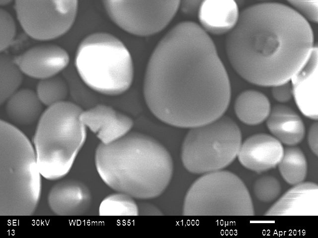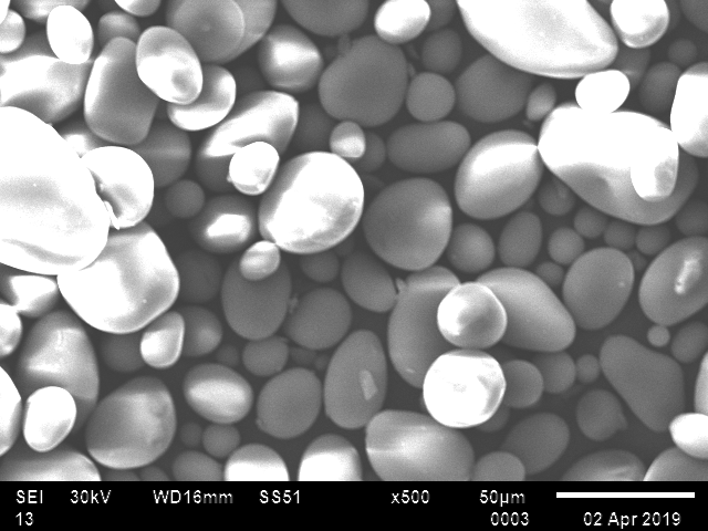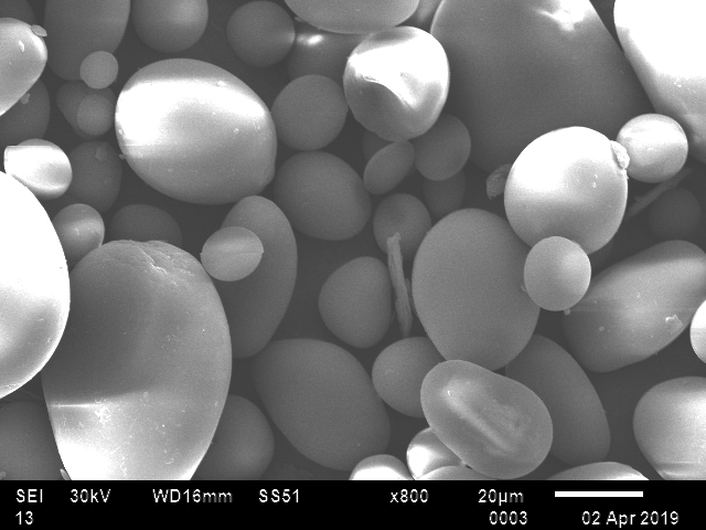 Surface morphology of the potato starch and starch malonate was confirmed by doing scanning electron microscopy. A double-sided sticking carbon tape of 200 nm thickness was used for placing the sample on SEM sample stub. Scanning electron photomicrographs were recorded at various magnifications to know the surface morphology of starch and starch malonate.