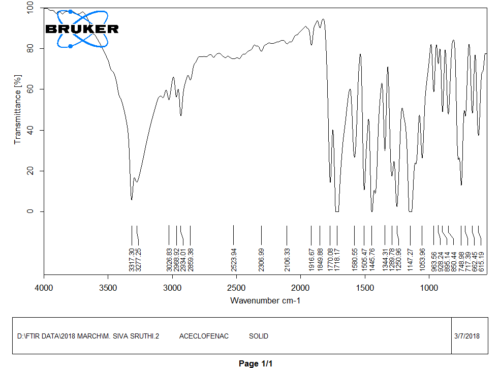 FTIR studies were performed by IR Spectroscopy method, using KBr disc as reference. Drug-excipient mixture was prepared in 1:1 ratio and study was performed. FTIR spectra was recorded on samples prepared in potassium bromide (KBr) disks using a BRUKER FT–IR, (Tokyo, Japan). KBr disks of samples were made at 6-8 tons hydrostatic press and analyzed sample between scanning range 500 to 4000 cm-1.