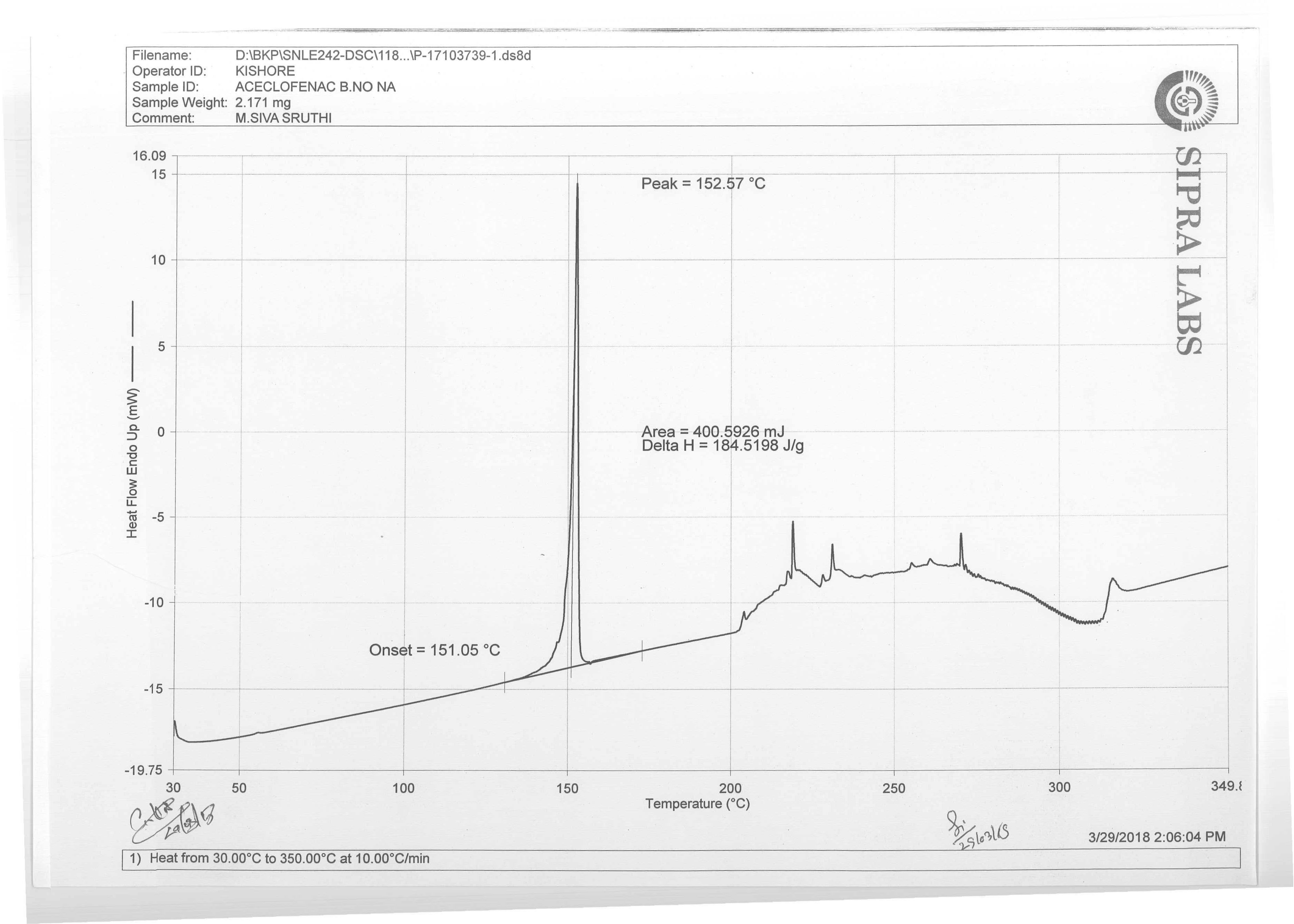 Thermogram was recorded on Perkin Elmer Thermal Analyser. Thermogram of pure drug (aceclofenac) and excipient drug mixture in 1:1 ratio was recorded and compared.