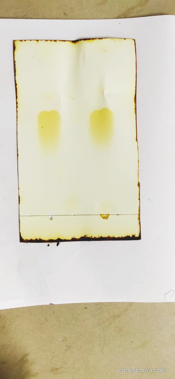 Mobile phase was prepared as per ratio given and kept in TLC chamber undisturbed for 24 h in order to saturate the camber. With the help of narrow capillary tube, pure drug, drug with excipient were spotted on the activated silica plate. The spotted plates were kept in the thin layer chromatography (TLC) chamber and allowed to run mobile phase. The plates were dried and kept in iodine chamber to develop the spots. Determine the retardation factor (Rf) by using the formula given below: