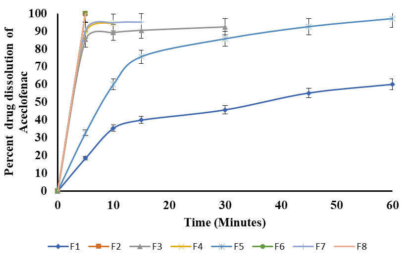 The in vitro dissolution studies of aceclofenac fast dissolving tablets were performed using 8 stage dissolution test apparatus (Electrolab TDT-08L) fitted with paddles (50 rpm) at 37±0.50C, using pH 7.4 phosphate buffer (900 ml) as a dissolution media. At defined time intervals, 5 ml samples were withdrawn, filtered through a 0.45µ membrane filter, diluted and assayed at 274 nm using a schimadzu UV/Visible double beam spectrophotometer. Cumulative percentage drug dissolution was measured using standard absorbance from the calibration curve [11]. In vitro dissolution experiments were conducted in triplicate (n = 3)