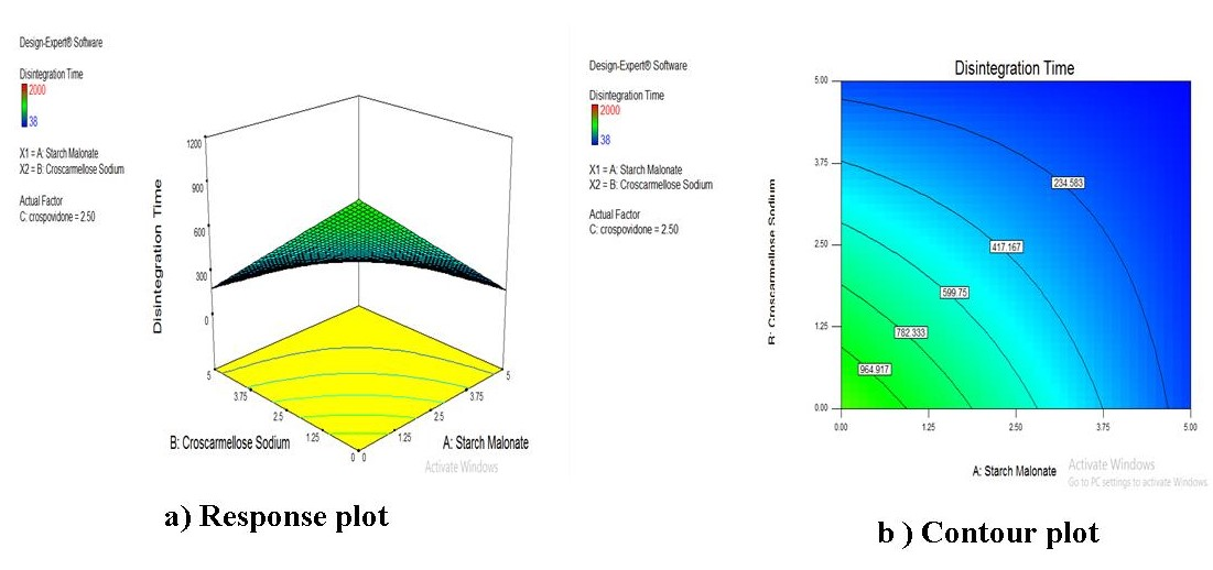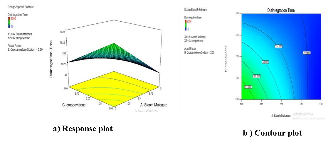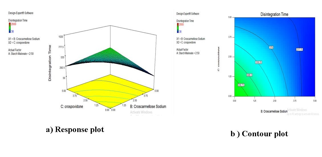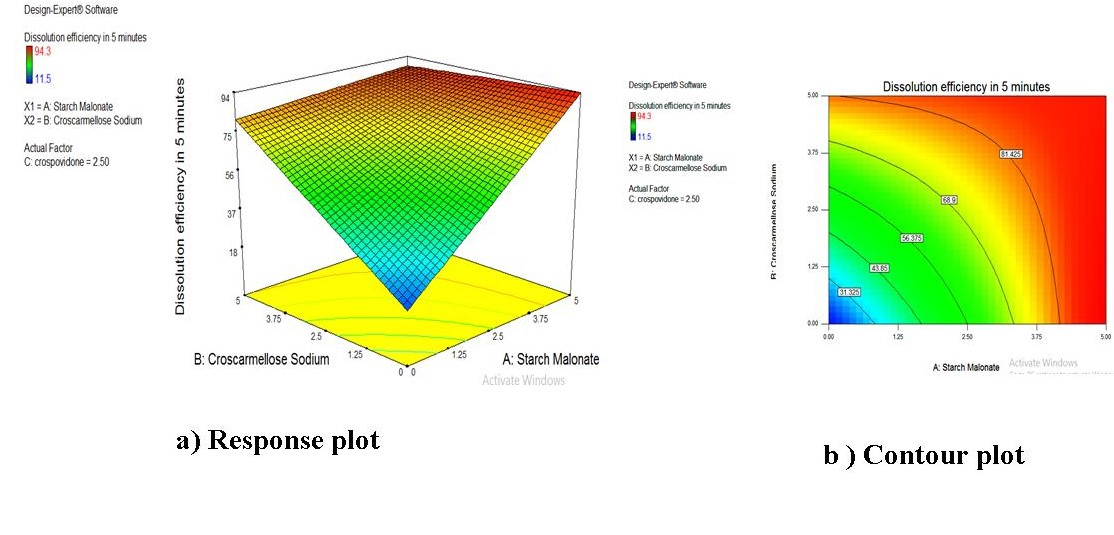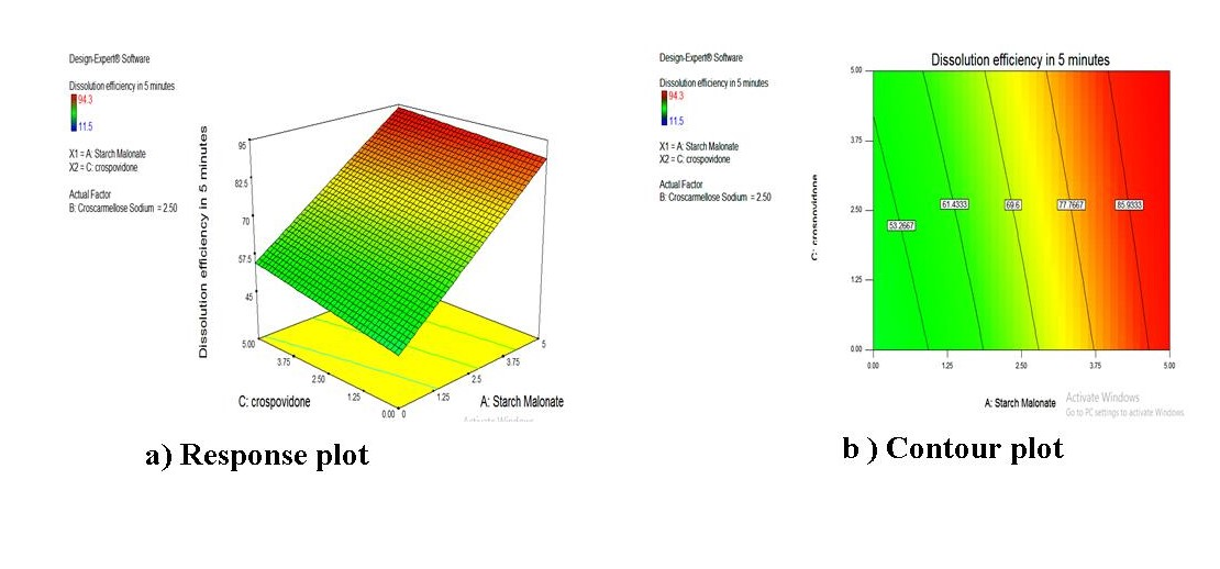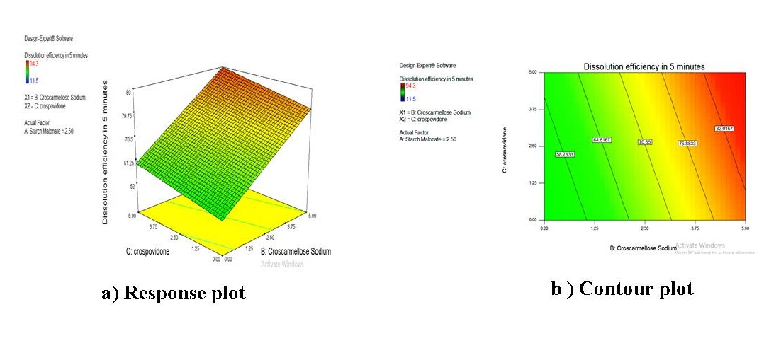To co-relate the independent variables (starch malonate (A), croscarmellose sodium (B) and crospovidone (C)) with dependent variables (disintegration time and dissolution efficiency in 5 min), polynomial regression algorithm equation was developed. By using Design Expert 7.11 version software, contour plots and response surface plots were drawn. Optimized formula was selected based on the statistical analysis of equation developed and plots dawn,