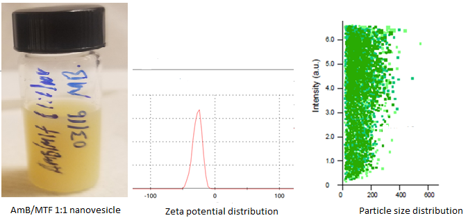 Fig. 1: Particle size (nm) and zeta potential distributions (mV) of the AmB-MTF 1:1 nanovesicles