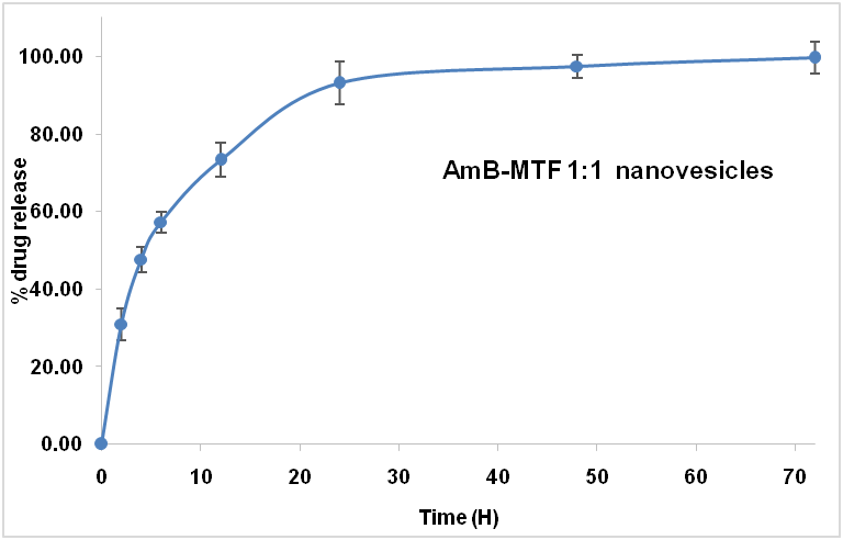 The results of in vitro drug release study of the AmB-MTF 1:1 nanovesicles formulation showed drug release of 99.51% in 72 h. It is also evident from the result that about 50% of AmB was released in the first 6 h, and about 93% of AmB was released in the first 24 h while the remaining undergo a more extended release up to a period of 72 h (fig. 2). The higher drug release rate of the poorly-water soluble AmB in the first 12 h may be due to the surfactant effect of miltefosine [25]. In vitro drug release study is performed in order to assess the potential of nanovesicles to control the release of drugs incorporated for prolonging the action [26].