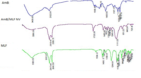 Fig. 3: FTIR spectra of AmB, miltefosine and AmB-MTF nanovesicles