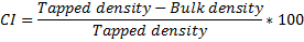 A volume of 10g of each powder was filled in a 25 ml measuring cylinder that was tapped 15 times or until there was no change in the powder volume [23]. The CARR’s index (CI) and Hausner Ratio (HR) indicators were estimated according to the following equations (Eq. 1 and 2) [24-26]: