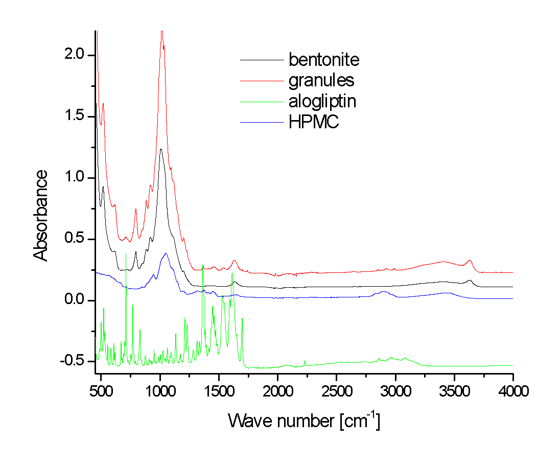 Fig. 2: FTIR-spectra of each of alogliptin, hydroxypropyl methylcellulose (HPMC), bentonite, and the prepared granules of previous components